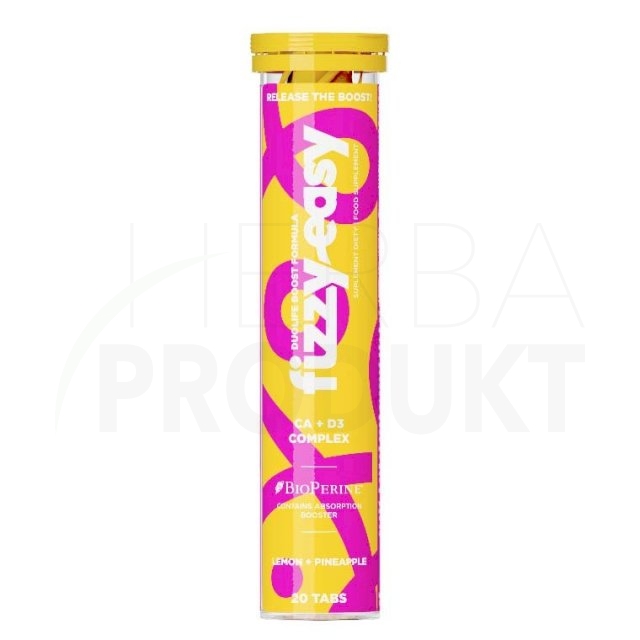 DuoLife Boost Formula FIZZY EASY Ca + D3 COMPLEX jsou šumivé tablety k přípravě osvěžujícího nápoje s ovocnou příchutí (citronovo-ananasová příchuť).