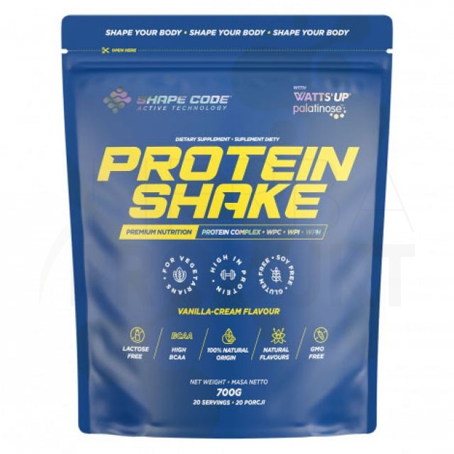 Je doplněk stravy v podobě proteinového koktejlu nové generace, který díky přítomnosti tří druhů bílkovin podporuje proces budování netukové svalové hmoty. Do koktejlu byly přidány složky s klinicky prokázaným účinkem – Palatinóza™ a WATTS’UP®*, které při pravidelném užívání podporují tělesný výkon při cvičení. SHAPE CODE® Protein Shake je ideálním řešením pro profesionální i rekreační sportovce, kteří chtějí budovat svalovou hmotu a udržet optimální efektivitu prováděných cviků.