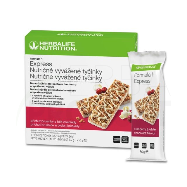 Tyčinky Formula 1 Express s příchutí brusinek a bílé čokolády jsou lahodnou náhradou jídla, kombinující křupavou ovesnou vločku a brusinky, zalité bílou čokoládou. Díky této nutričně vyvážené tyčince, bohaté na bílkoviny, vlákninu a obsahující 25 vitamínů a minerálů, nemusíte nikdy opomíjet jídlo.