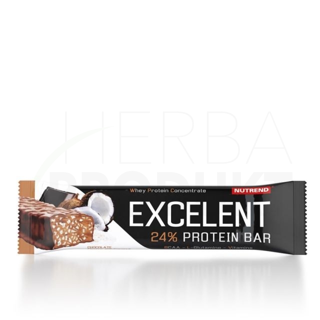 EXCELENT PROTEIN BAR příchuť čokoláda + kokos: glukózo-fruktózový sirup, mléčná čokoláda 14 % (cukr, kakaové máslo, kakaová hmota, sušené plnotučné mléko, emulgátory sójový lecitin a E 476, vanilkový extrakt), izolát sójových bílkovin, syrovátkový proteinový koncentrát, invertní sirup, sójové vločky, rostlinný tuk (palmojádrový, palmový, bambucký), krém s lískovými oříšky (cukr, palmový a bambucký olej, sušená syrovátka, lískové ořechy, kakao, emulgátor sójový lecitin, aroma), kokos 4 % (kokos, antioxidant oxid siřičitý), kukuřično-bramborový extrudát (kukuřičná krupice, bramborová kaše, cukr, pšeničná vláknina), emulgátor řepkový lecitin, kakao, aroma, L-glutamin, zahušťovadlo guarová guma, antioxidant směs přírodních tokoferolů, L-leucin, vitaminový premix (vitamíny: C, niacin, E, kyselina pantotenová, B2, B6, B1, kyselina listová, biotin, B12), L-isoleucin, L-valin, konzervant kyselina sorbová.