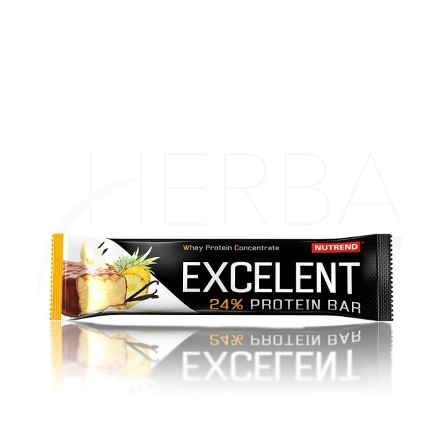 EXCELENT PROTEIN BAR příchuť vanilková s ananasem: glukózo-fruktózový sirup, mléčná čokoláda 14 % (cukr, kakaové máslo, kakaová hmota, sušené plnotučné mléko, emulgátory sójový lecitin a E 476,vanilkový extrakt), izolát sójových bílkovin, syrovátkový proteinový koncentrát, invertní sirup, sójové vločky, rostlinný tuk (palmojádrový, palmový, bambucký), krém s příchutí vanilky (cukr, palmový a bambucký olej,sušená syrovátka, sušené odstředěné mléko, emulgátor sójový lecitin, aroma, barvivo E 160c), ananas proslazený 4 % (ananas, cukr, antioxidant kyselina citronová, konzervant oxid siřičitý), kokos (kokos, antioxidant oxid siřičitý), kukuřično-bramborový extrudát (kukuřičná krupice, bramborová kaše, cukr, pšeničná vláknina), emulgátor řepkový lecitin, L-glutamin, zahušťovadlo guarová guma, antioxidant směs přírodních tokoferolů, aroma, L-leucin, vitaminový premix (vitamíny: C, niacin, E, kyselina pantotenová, B2, B6, B1, kyselina listová, biotin, B12), L-isoleucin, L-valin, konzervant kyselina sorbová.