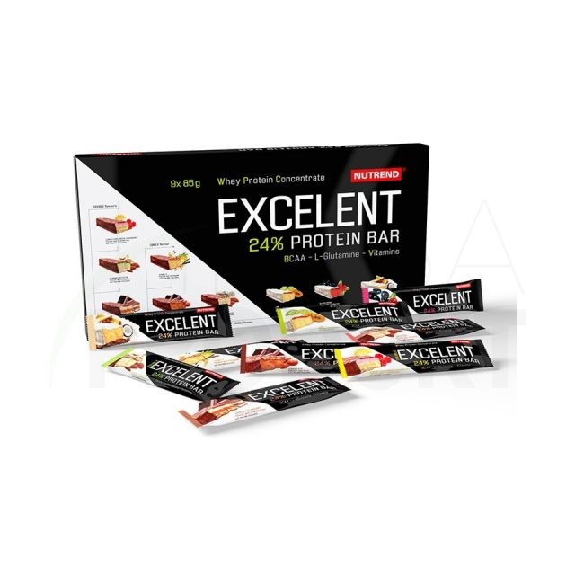 EXCELENT PROTEIN BAR příchuť čokoládová s oříšky: glukózo-fruktózový sirup, mléčná čokoláda 14 % (cukr, kakaové máslo, sušené plnotučné mléko, kakaová hmota, kakao, emulgátory sójový lecitin a E 476, vanilkový extrakt, aroma), izolát sójových bílkovin, syrovátkový proteinový koncentrát, invertní sirup, sójové vločky, rostlinný tuk (palmojádrový, palmový, bambucký), krém s lískovými oříšky (cukr, palmový a bambucký olej, sušená syrovátka, lískové ořechy, kakao, emulgátor sójový lecitin, aroma), pražené lískové ořechy 4 %, kokos (kokos, antioxidant oxid siřičitý), kukuřično-bramborový extrudát (kukuřičná krupice, bramborová kaše, cukr, pšeničná vláknina), emulgátor řepkový lecitin, kakao, aroma, L-glutamin, zahušťovadlo guarová guma, antioxidant směs přírodních tokoferolů, L-leucin, vitaminový premix (vitamíny: C, niacin, E, kyselina pantotenová, B2, B6, B1, kyselina listová, biotin, B12), L-isoleucin, L-valin, konzervant kyselina sorbová.
